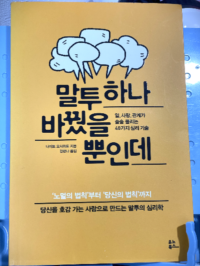 -학창 시절과 직장생활을 지내오면서 매번 느낀 점이 말투 하나로 상대방과의 오해가 생기거나 제가 다른 사람을 오해하게 되는 일이 빈번히 있었습니다. 성인이 되어 직장생활을 몇 년간 해오다 보니 말투가 중요하다는 생각이 들어서 이 책을 읽게 되었고, 말투 하나 바뀐 걸로 사람들과의 대인관계가 좀 더 원활해지는 것을 직접 느낄 수 있었습니다. 그래서 이 글을 읽는 당신도 말투 하나 바꿨을 뿐인데, 바뀌는 것은 많아지는 일들을 경험했으면 좋겠어서 추천드립니다.