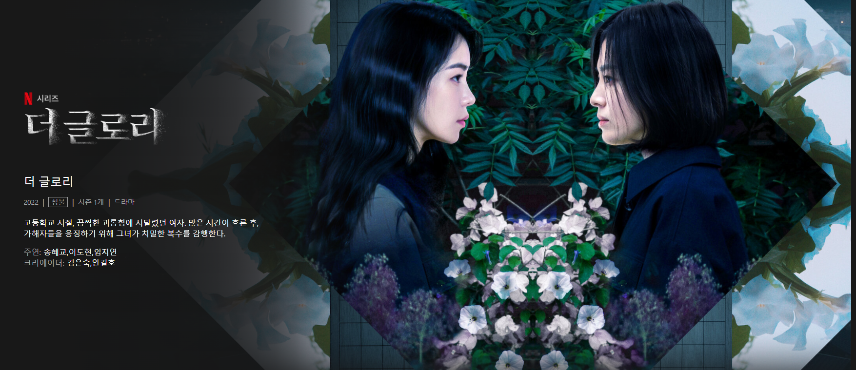 넷플릭스의 드라마인 더 글로리는 대한민국에서 만들어진 드라마입니다. 고등학교 시절, 끔찍한 학교폭력의 괴롭힘에 시달렸던 한 학생이 복수를 다짐하고 성인이 되어 자신을 괴롭혔던 가해자들에게 복수를 하는 내용입니다.